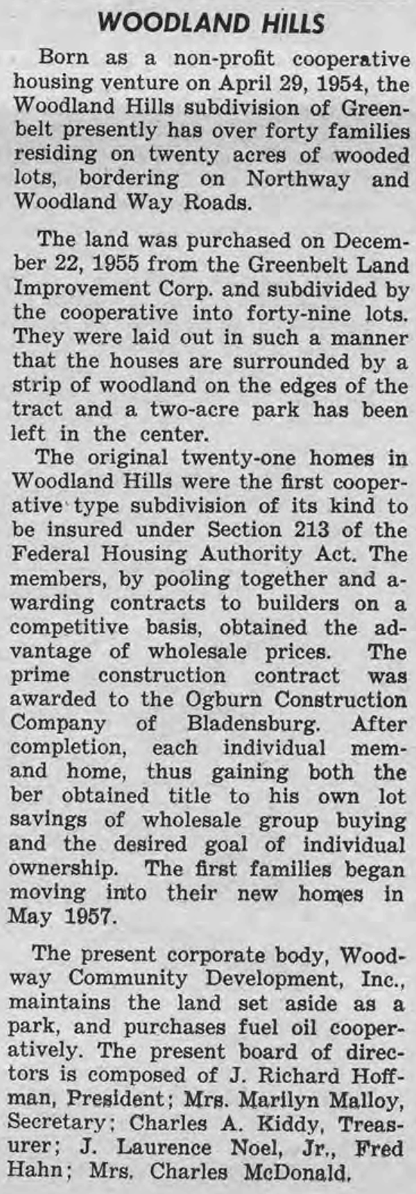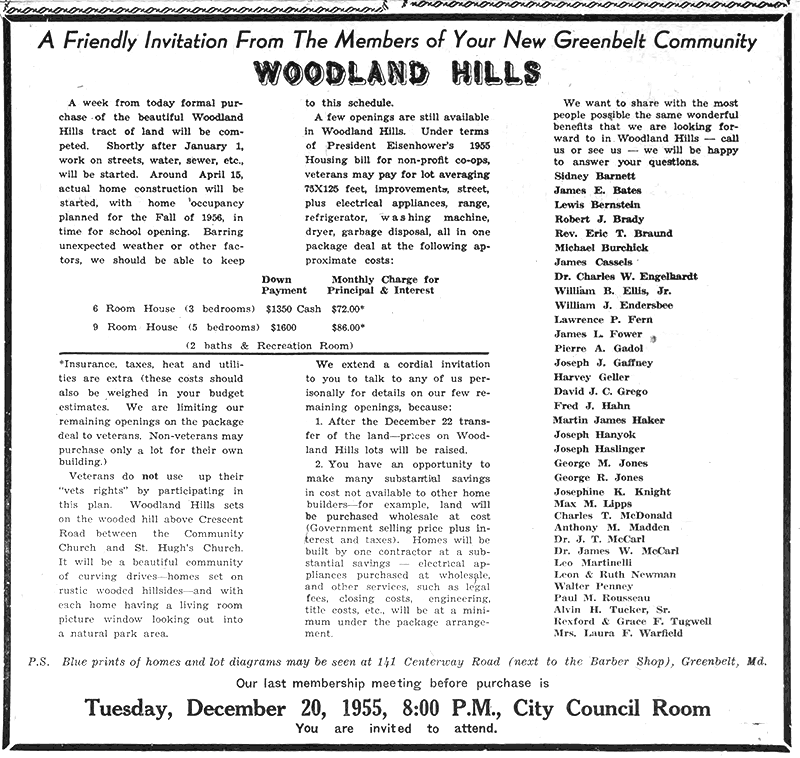 Here's an ad announcing Woodland Hills to Greenbelt, in the December 15, 1955 Greenbelt News Review. Search the entire New Review archive with the box in the upper right at https://www.greenbeltnewsreview.com/archives/
